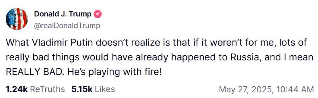 “Regarding Trump’s words about Putin ‘playing with fire’ and ‘really bad things’ happening to Russia. I only know of one REALLY BAD thing — WWIII.”