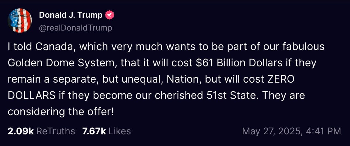 "I told Canada, which very much wants to be part of our fabulous Golden Dome System, that it will cost $61 Billion Dollars if they remain a separate, but unequal, Nation, but will cost ZERO DOLLARS if they become our cherished 51st State," Trump wrote on Truth Social.