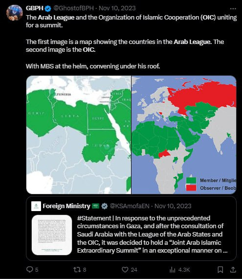 It was at this meeting last fall where MBS formed the "Ministerial Joint Contact Group" of the Arab League and OIC, which then went on a world tour— led by Saudi Foreign Minister Faisal bin Farhan— that ran through Beijing, Moscow, Paris, and London, among other cities of diplomatic importance. I believe that some of the most important groundwork of the Sovereign Alliance was laid at these meetings, and posted about it at the time.