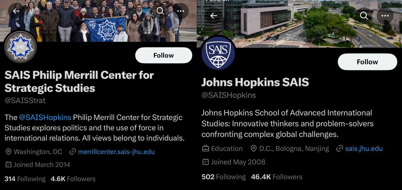 The other letters are also interesting, and seemingly relevant: the Philip Merrill for Strategic Studies from the John Hopkins School of Advanced International Studies, which claims to “explore politics and the use of force in international relations.”