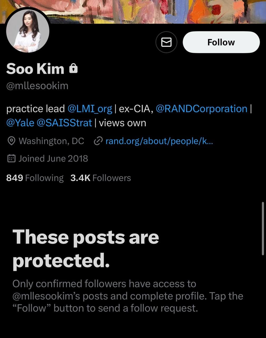 She has protected her tweets. (Some anon out there has them, be sure of that.) But we can still see her bio.