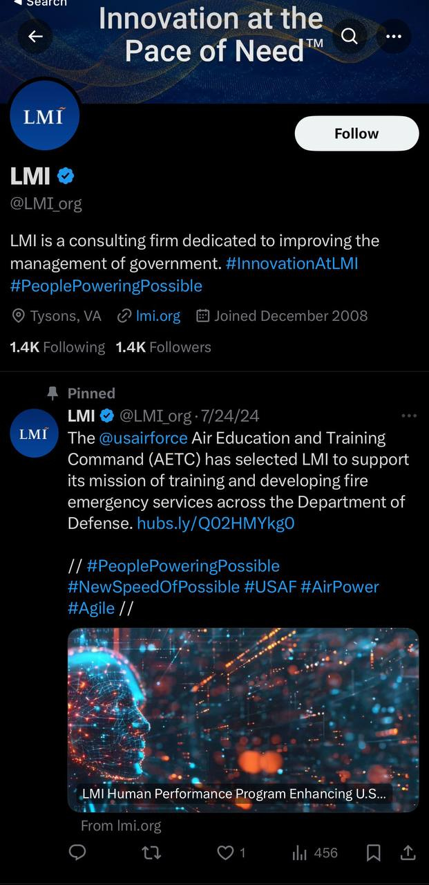 The first is LMI, a self-described consulting firm “dedicated to improving the management of government,” whose pinned post mentions running a training program across the Department of Defense. (The post got one measly like. Sad.)
