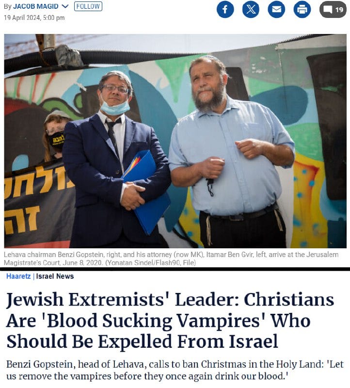 And who was at the center of the action? National Security Minister Itamar Ben-Gvir, the same radicalized zealot who I have previously reported on as part of a number of stories, including being the defense lawyer for Benzion Gopstein—Ben-Gvir's mentor and the political leader who in 2015 called for the burning of churches and expulsion of Christians from the Holy Land. (The very reason Ben-Gvir had to defend him against criminal charges of incitement.)