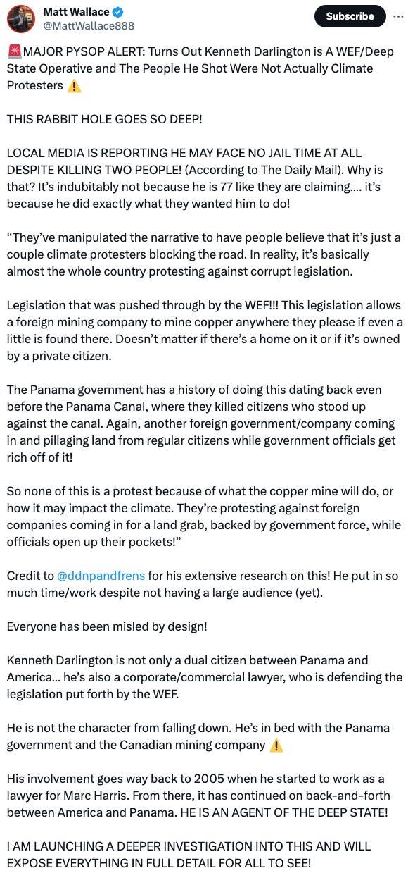 I’m sure many people reading this saw the video that came out on November 8th, 2023, of the alleged 77-year-old retired American lawyer Kenneth Darlington irritated by a group of climate change activists who were blocking the road in Panama. He pulled out a gun and killed two of them, straight out of the movie “Falling Down”. We are to believe this guy was having a bad day and just wanted to get home and have a cold beer, he was so frustrated at the climate activists that he pulled out a gun that he conveniently had in his pocket and killed two people.