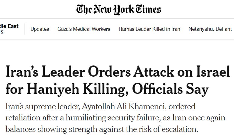 As most of you will undoubtedly be aware by the time this piece comes out, Ismail Haniyeh, the political leader of Hamas, was assassinated via missile strike last week in an attack that is obviously being attributed to Israel.