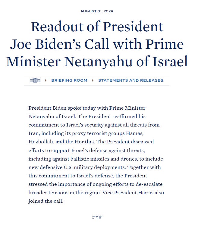I love the last sentence where they attempt to make Kamala seem relevant—that she “joined the call,” but it’s uncertain if she said anything or just happened to be in the room. Honestly, it’s uncertain if this call ever actually even happened at all; we just have to take their word for it, and even if we do, all we can extrapolate from this is that the Biden Administration—and from the sounds of it—a hypothetical Harris administration as well, plans to continue arming and funding Israel unimpeded.