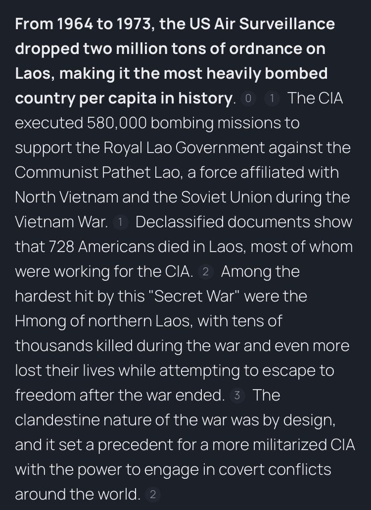 Here’s a great summary of this secret war the CIA was waging in Laos for control of the opium supply by a Summarizer tool on Brave search engine. I couldn’t say it any better: