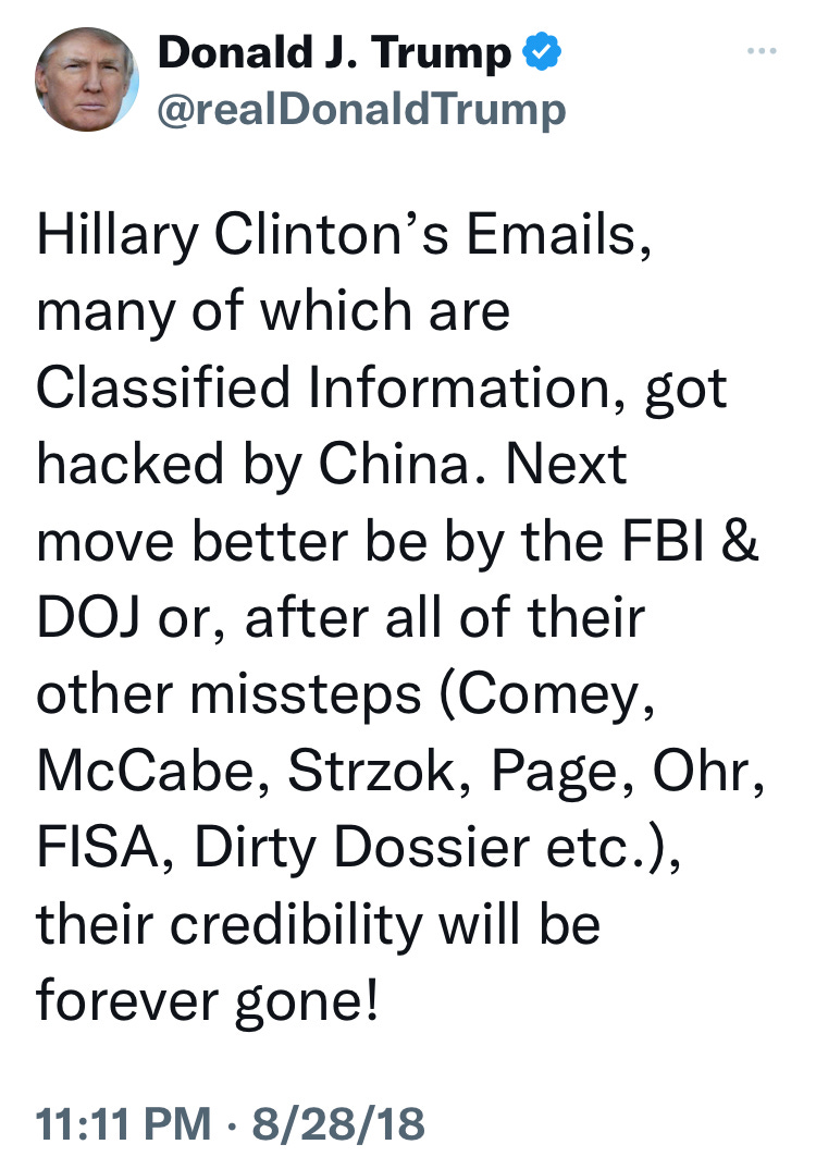 Remember, at the time, the intelligence community, FBI and DOJ were all filled with corrupt Obama loyalists who were in place to prevent Hillary’s prosecution, or Obama being exposed as authorizing it. The FBI investigation into Hillary’s private server was concluded with no indictments or prosecutions. Is that the end of the story?