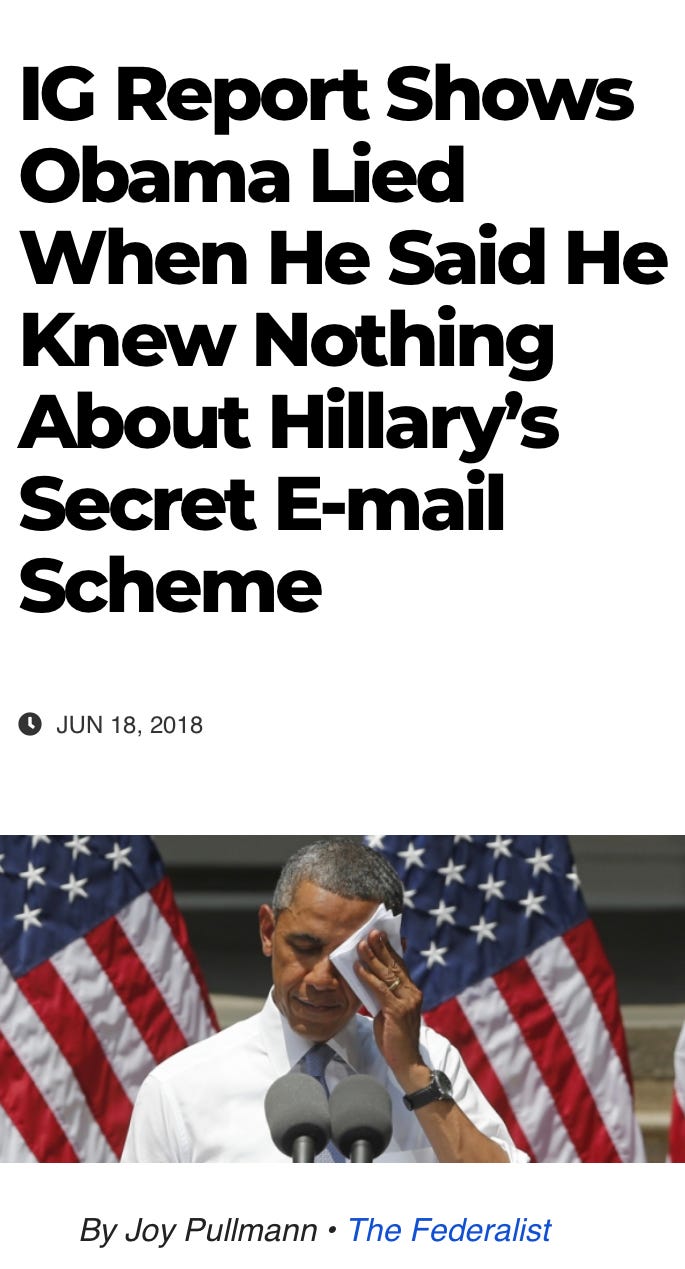 In 2015, President Obama told America he only learned that his secretary of state Hillary Clinton was illegally using a private email server to conduct public business after The New York Times published a story saying so. Today’s release of a Department of Justice inspector general report shows that was a lie.