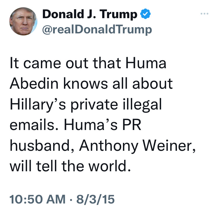 Trump also made an interesting statement in August of 2016 when news broke about Huma Abedin seperating from Weiner.