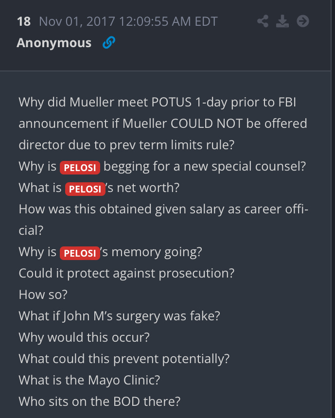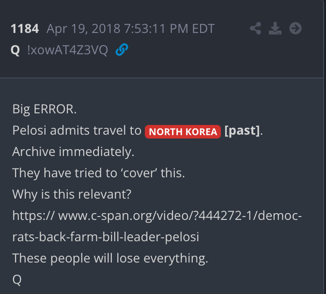 The interview that Pelosi gave was in April 2018, right before these Q posts. She was coming out publicly against the Republican farm bill in Congress because they were cutting billions from the SNAP program.