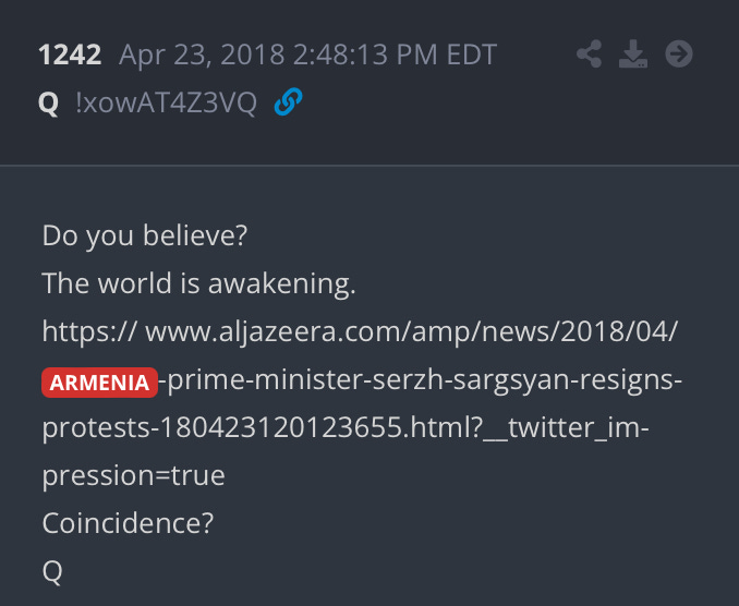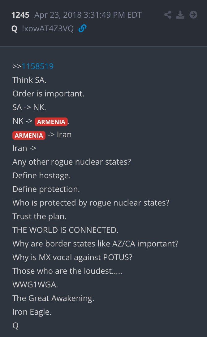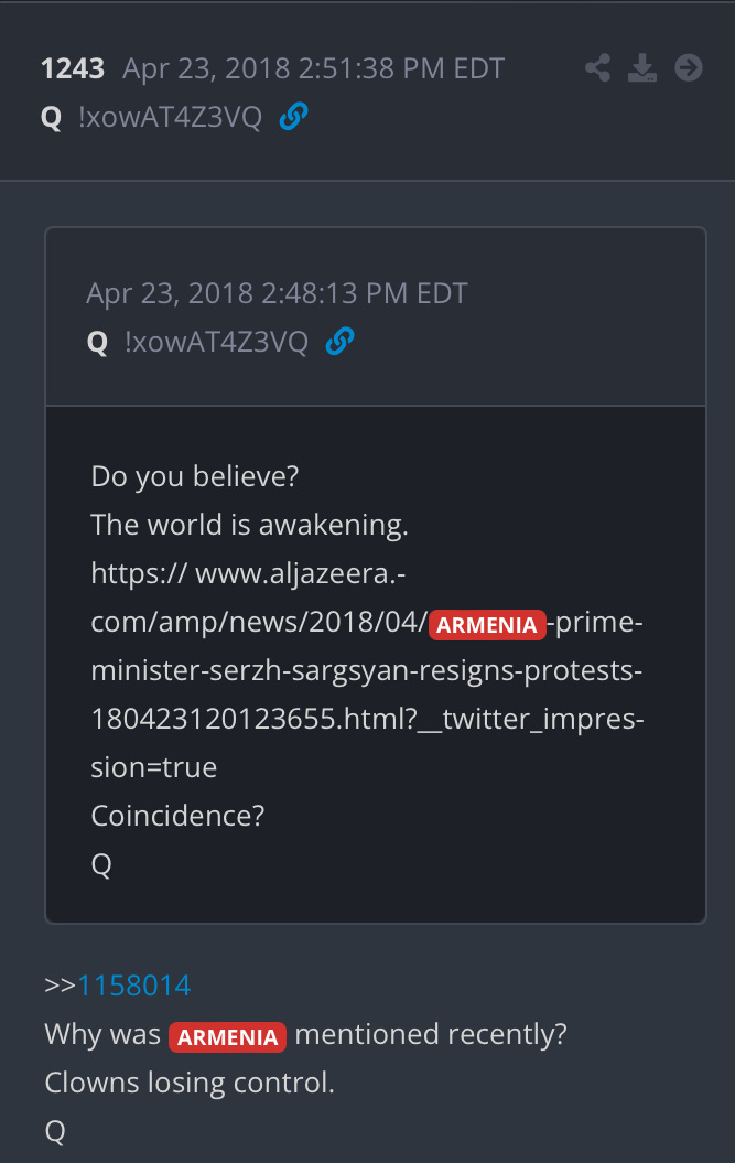 But Q re-posted that drop again on the same day about Armenia, and added something important: