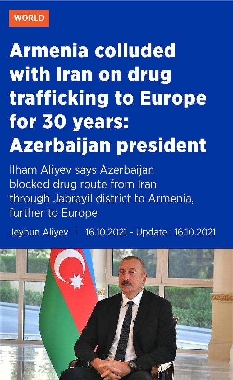 "Over the past year, after Azerbaijan had regained control over the 130-kilometer (81-mile) section of the state border with Iran, which was under the control of Armenia for about 30 years, and thereby blocked a drug trafficking route from Iran through the Jabrayil district of Azerbaijan to Armenia and further to Europe, the volume of heroin we have seized in other sections of the Azerbaijan-Iran border has doubled compared to the same period of previous years. This suggests that for about 30 years, Armenia, in collusion with Iran, used the occupied territories of Azerbaijan to carry out drug trafficking to Europe," Ilham Aliyev said while addressing the Commonwealth of Independent States (CIS) Heads of State Council's session via videoconference.