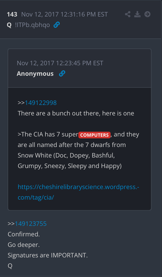 Q mentions Snow White a lot in the drops. It is mostly referencing the CIA, and also these specific super computers.