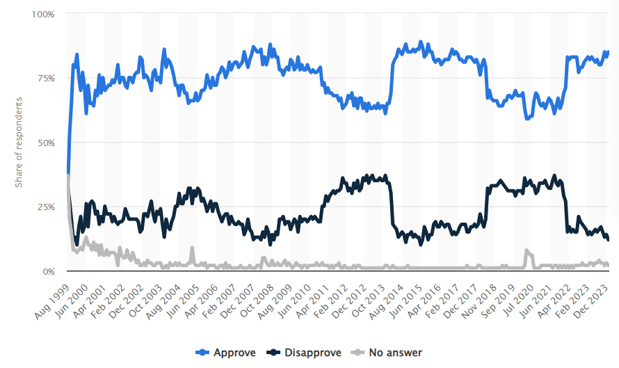 Alexei Navalny is often cast as Putin’s primary competition, but it’s not as if he had a significant percentage of the country behind him, as his approval at its height barely cracked the double digits. Additionally, he’s been incarcerated for almost three years, in a prison near the Arctic, completely out of sight and out of mind. He posed zero threat to Putin in that state. Not to mention, Putin is currently enjoying a rally-'round-the-flag moment.