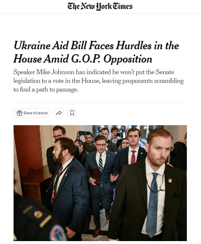 Ever since the war in Ukraine broke out, it’s been one multibillion-dollar aid package after another, but the spigot has been turned off since Mike Johnson took over as Speaker of the House. Now, I have mixed feelings about Mike Johnson, but he has so far kept his word that there would be no spending packages approved until the border was secured, and that any further aid to Ukraine would be offset by spending cuts.