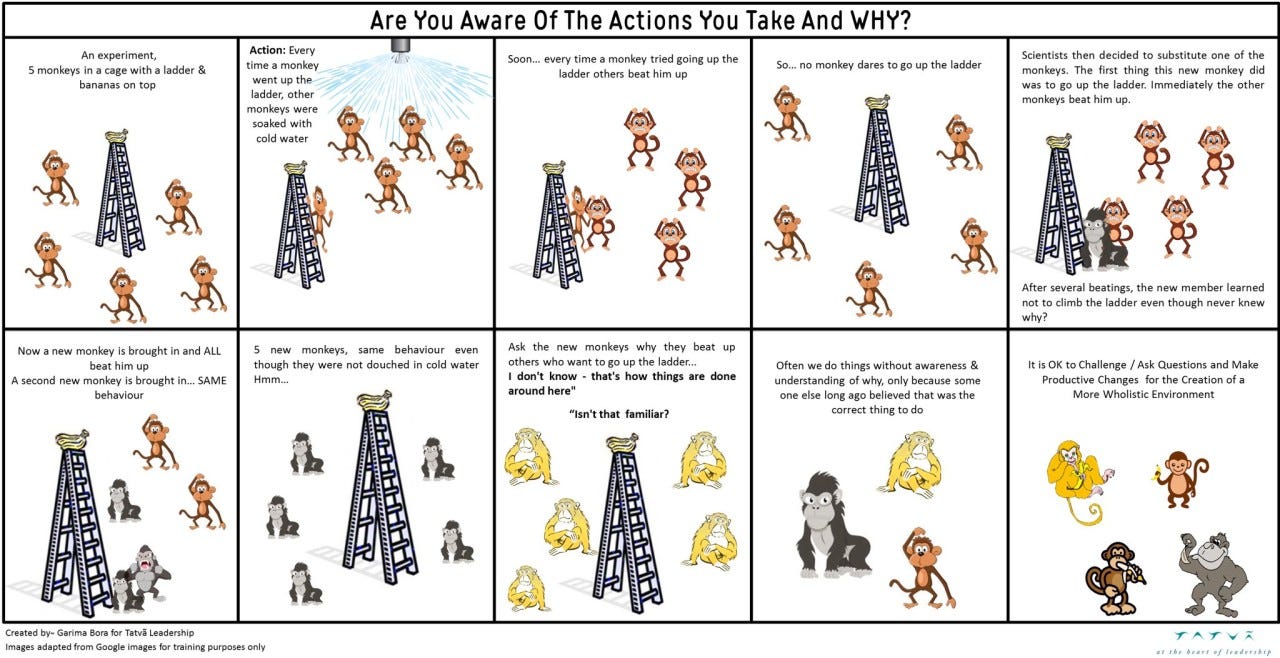 A perfect example is the Five Monkeys Experiment, a well-known allegory on conditioned behavior.
