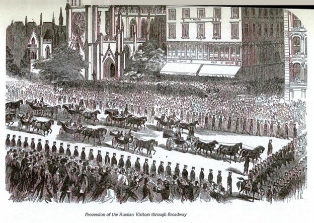 Surely the outcome of the Civil War would have been much darker had it not been for Czar Alexander II’s deployment of the Russian navy to California and Atlantic coasts of America in 1863, which kept British and French forces from assisting the confederacy in open warfare against Lincoln. Many Americans would be shocked to learn that Russian soldiers were celebrated by crowds of thousands in San Francisco and New York during the height of the Civil War.