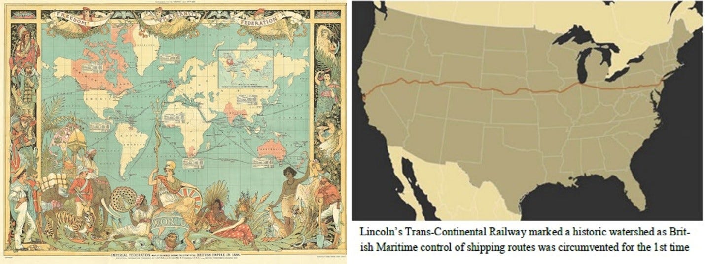 During this 1867 purchase, Lincoln’s Trans Continental Railway, begun in 1863 at the height of the Civil War was a mere two years from completion, linking the Pacific to Atlantic for the first time in history, and thus destroying the British monopoly over maritime shipping routes.