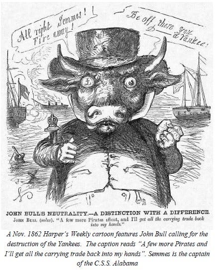 Britain’s air of neutrality was betrayed by her construction of Confederate war ships that unleashed havoc on Lincoln’s Navy. The court ruled in favor of America, and soon Britain came close to loosing its Canadian possessions as payment for their sin (Senator Charles Sumner and Secretary Seward both advocated this course), although weaker figures in America ended up agreeing to a measly $15 million settlement in 1872, while all wrongs were forgotten.