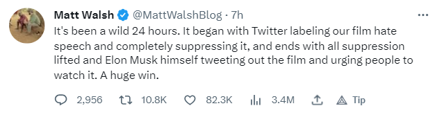 Walsh Tweeted, “It's been a wild 24 hours. It began with Twitter labeling our film hate speech and completely suppressing it, and ends with all suppression lifted and Elon Musk himself tweeting out the film and urging people to watch it. A huge win.”