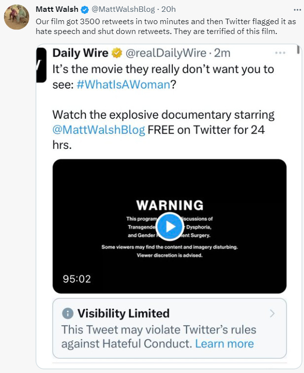 Last Wednesday, as The Daily Wire prepared to stream, “What is a Woman?” on Twitter, old Twitter seemed to rear its ugly head. Matt Walsh tweeted, “Our film got 3,500 retweets in two minutes and then Twitter flagged it as hate speech and shut down retweets. They are terrified of this film.”