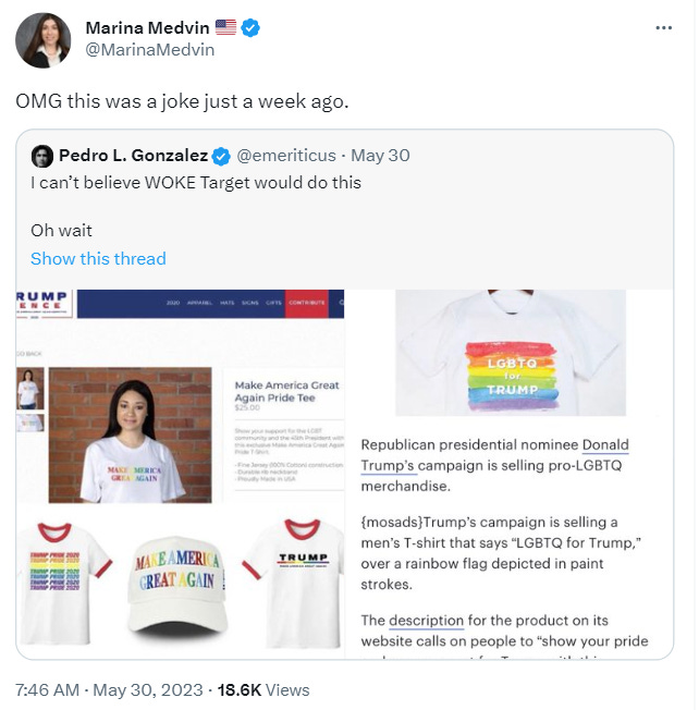 Last week, Twitter influencers—who appear to work for the DeSantis campaign—shared images of adult pride clothing on Donald Trump’s website as though it were a gotcha on MAGA’s response to Target.