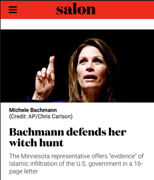 Senator McCain and others roundly criticized Rep. Michele Bachmann in 2012 when she and four members of the House Permanent Select Committee Intelligence and the House Judiciary Committee cited Ms. Abedin in letters sent to the Inspectors General of the Department of Defense, Department of State, Department of Justice, Department of Homeland Security, and the Office of the Director of National Intelligence, warning about Muslim Brotherhood INFILTRATION of the United States government.