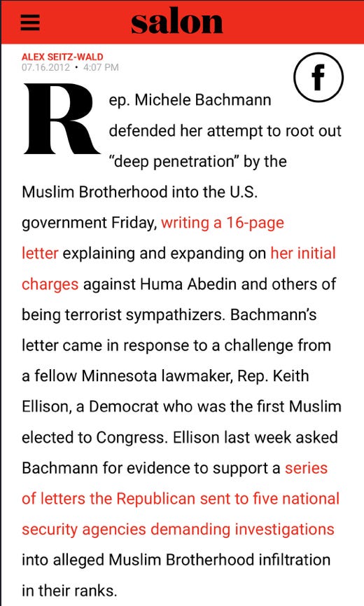She was a member of Congress from Minnesota, and she was publicly demanding that the five National Security Agencies investigate the infiltration of our government by the Muslim Brotherhood. She specifically named Hillary Clinton’s closest aide, Huma Abedin.