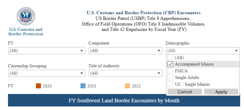 We should be able to look at the chart and see the carve out, but they’ve inexplicably stopped reporting that data point. Instead, we can change the search parameters to only report the number of Accompanied Minors: