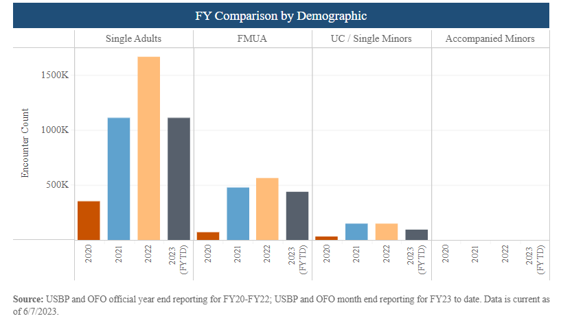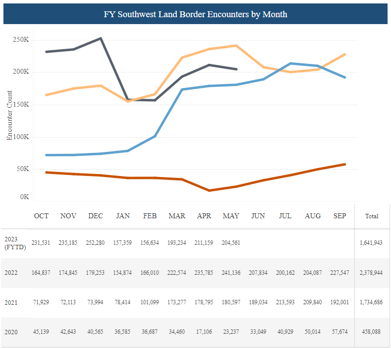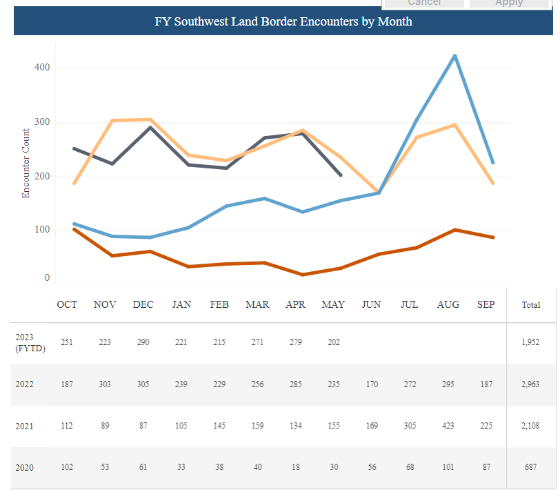 According to the US Customs & Border Protections statistics on encounters at the US Southern Border, border agent encounters with migrants exploded in the first year of Biden’s administration and continue to trend upward. In the final year of President Trump’s first term, there were 458,088 encounters. When Biden took over, that number more than tripled to 1,734,686. In 2022, there were 2,378,944, or more than five times the number of encounters than during the Trump administration. In 2023, the YTD numbers are up more than 100,000 over the same period last year.