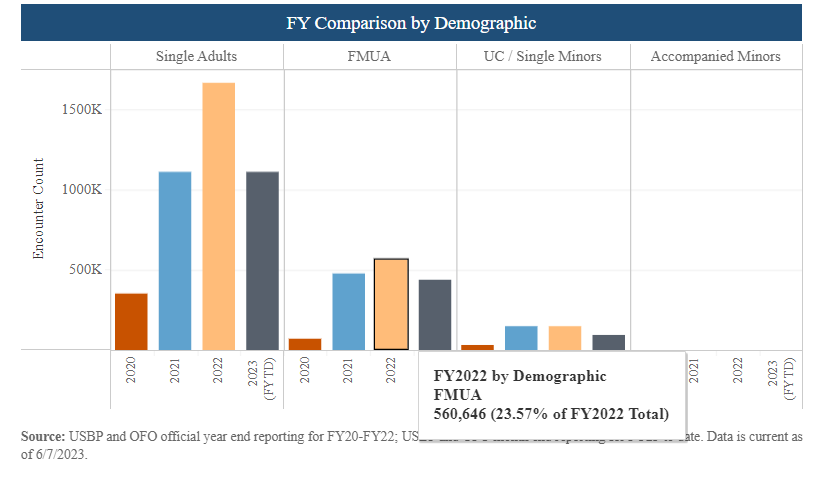 According to the US Customs & Border Patrol data, the number of migrants categorized as family units, or FMUA, was 560,646 — 23.57% of total encounters for that year. To be categorized as a family unit, you must have minor children with you. The obvious question, then, is how many of those 560,646 individuals in family units were children?
