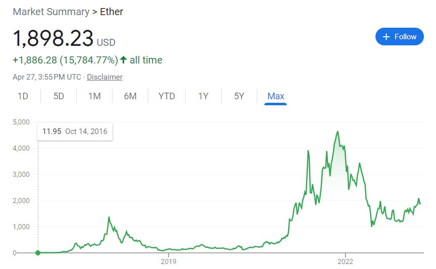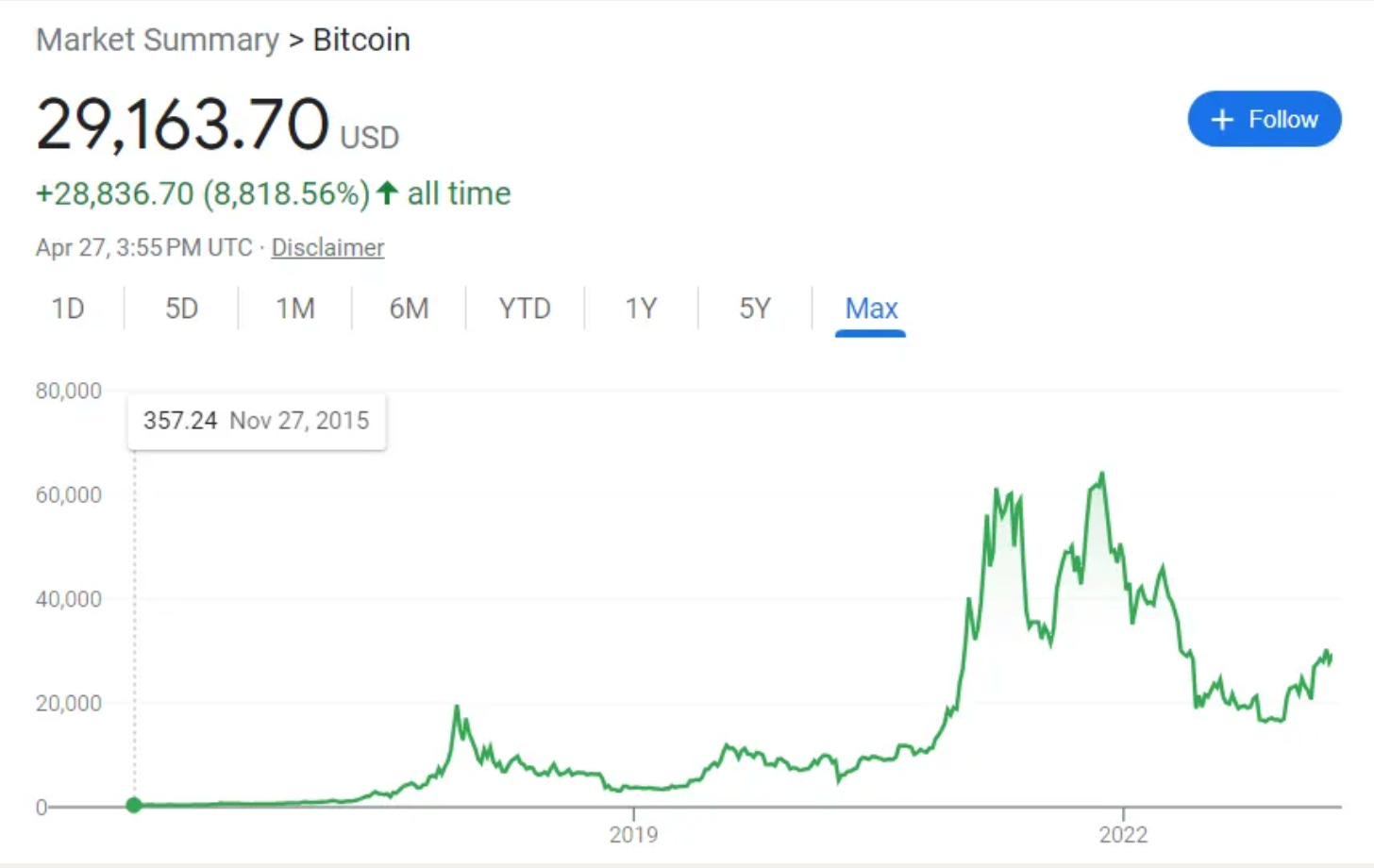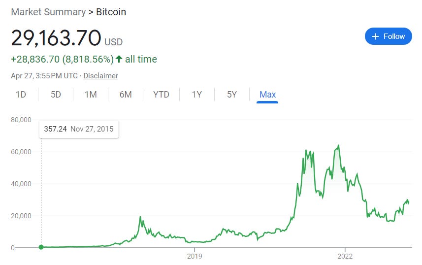 Bitcoin’s first transaction was used for two Papa John’s pizzas. Its initial value was less than a penny ($0.0008 USD), hit $0.08 USD by the end of the month, and grew to more than $68,000 at its peak. At the time I write this, Bitcoin is sitting at $29,163.70.