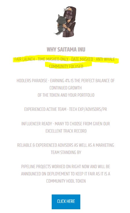 According to Sky, one of the investigators I spoke with, the Saitama project developers never disclosed the team tokens at the launch; rather, they claimed to have a fair launch on their website. The website is still up.