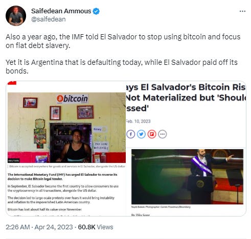 “Also a year ago, the IMF told El Salvador to stop using bitcoin and focus on fiat debt slavery. Yet it is Argentina that is defaulting today, while El Salvador paid off its bonds.”