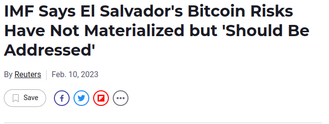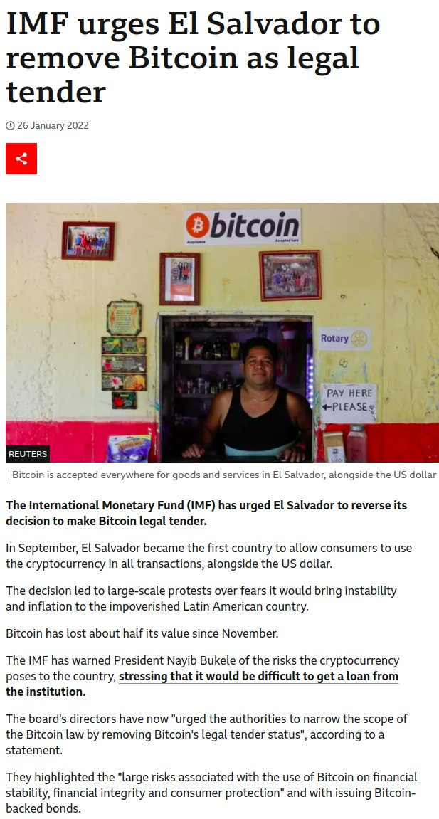 “IMF board members ‘urged the authorities to narrow the scope of the Bitcoin law by removing bitcoin’s legal tender status,’” the IMF said in a statement following a yearly consultation,” according to a January 25, 2022 Reuters article.