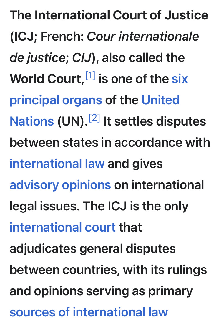 The ICJ is the United Nations tribunal for resolving international disputes. Its rulings are binding, but it has no power to enforce them.