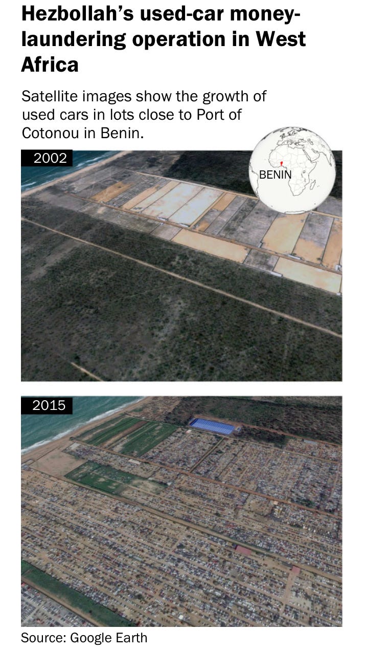 Hezbollah was laundering money through used car sales in America and shipping them to Africa.