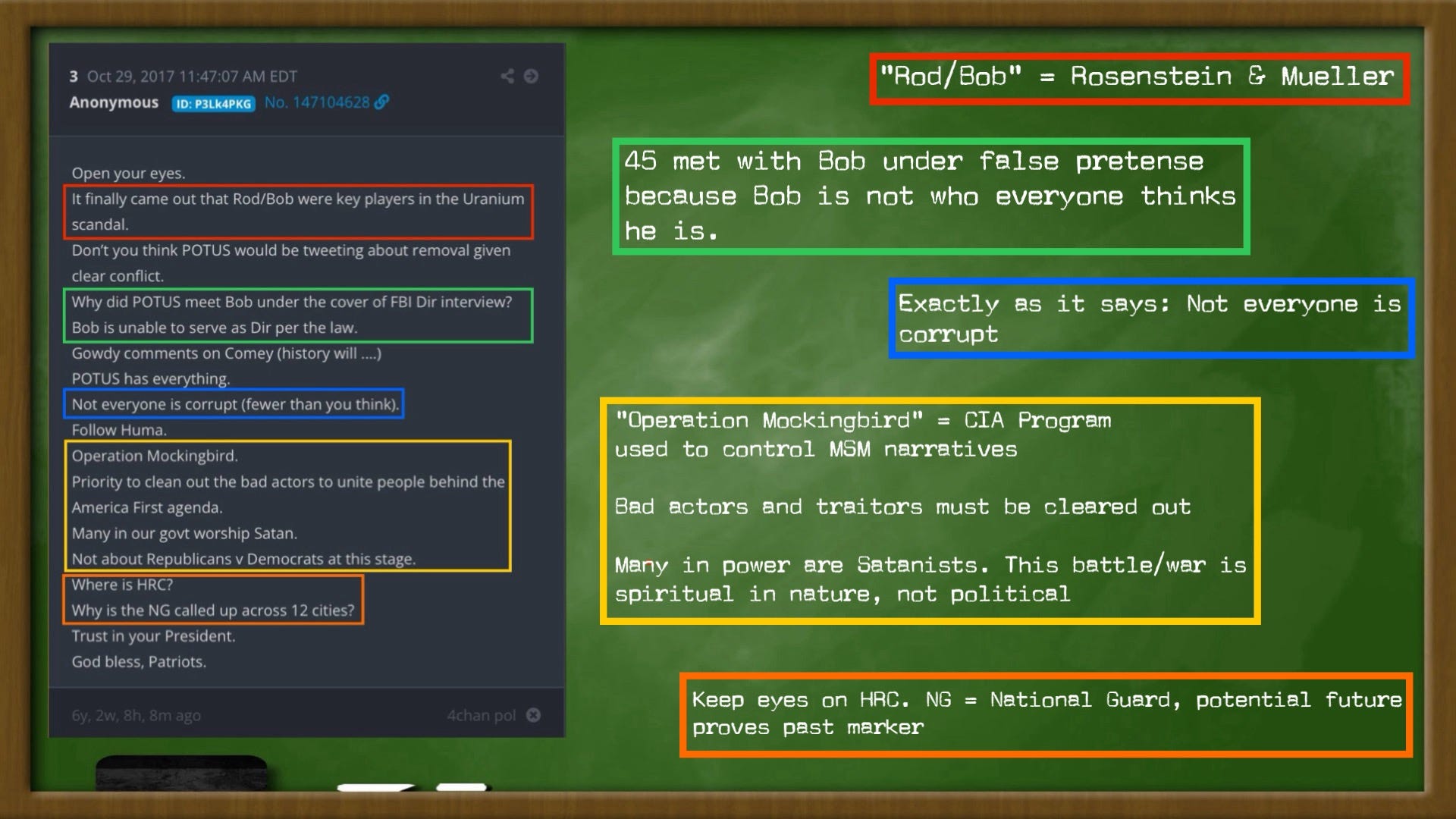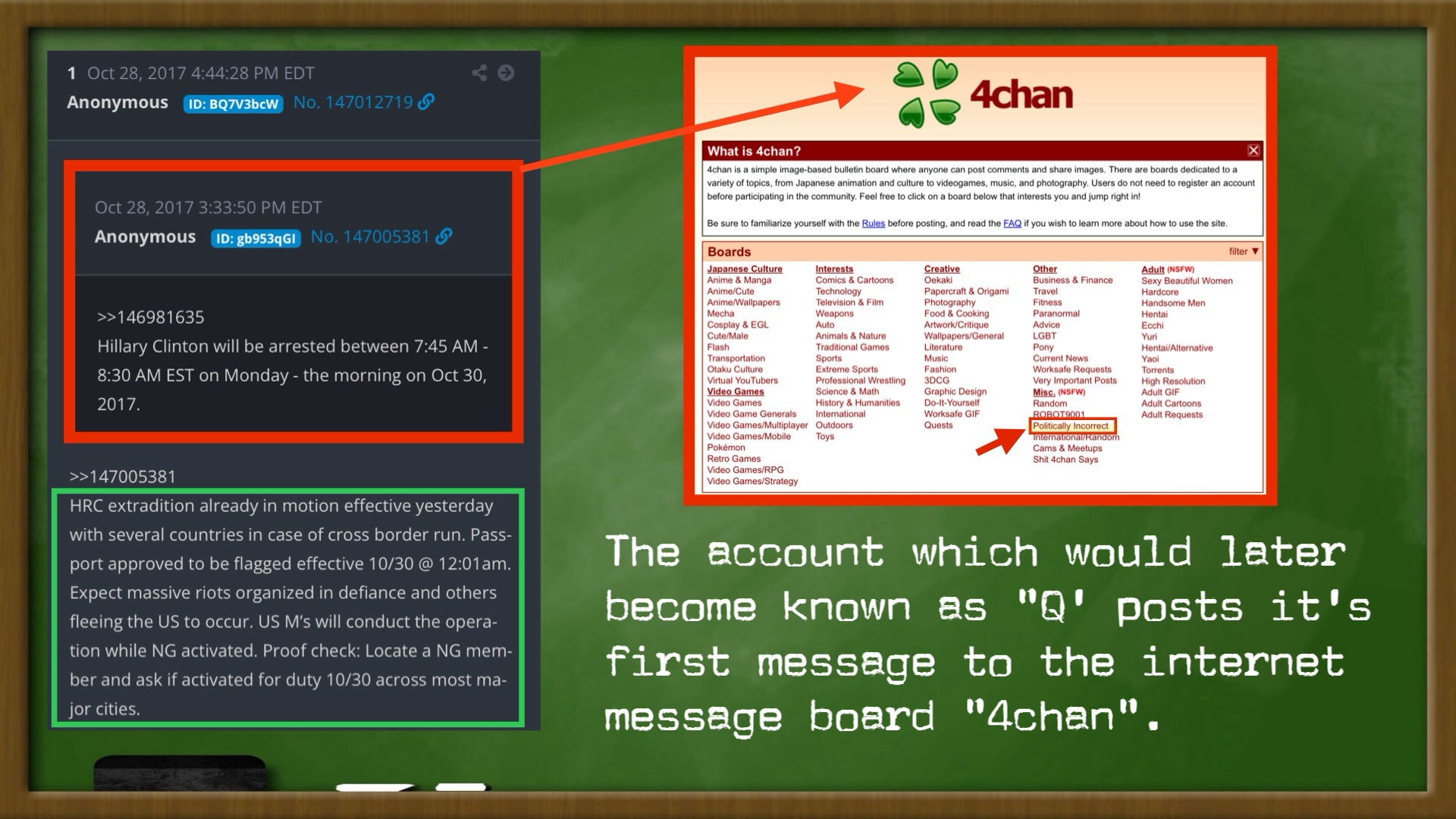 On October 28th, 2017, the account known as Q began posting to the message board known as “4chan” in the forum “Politically Incorrect”, or /pol.
