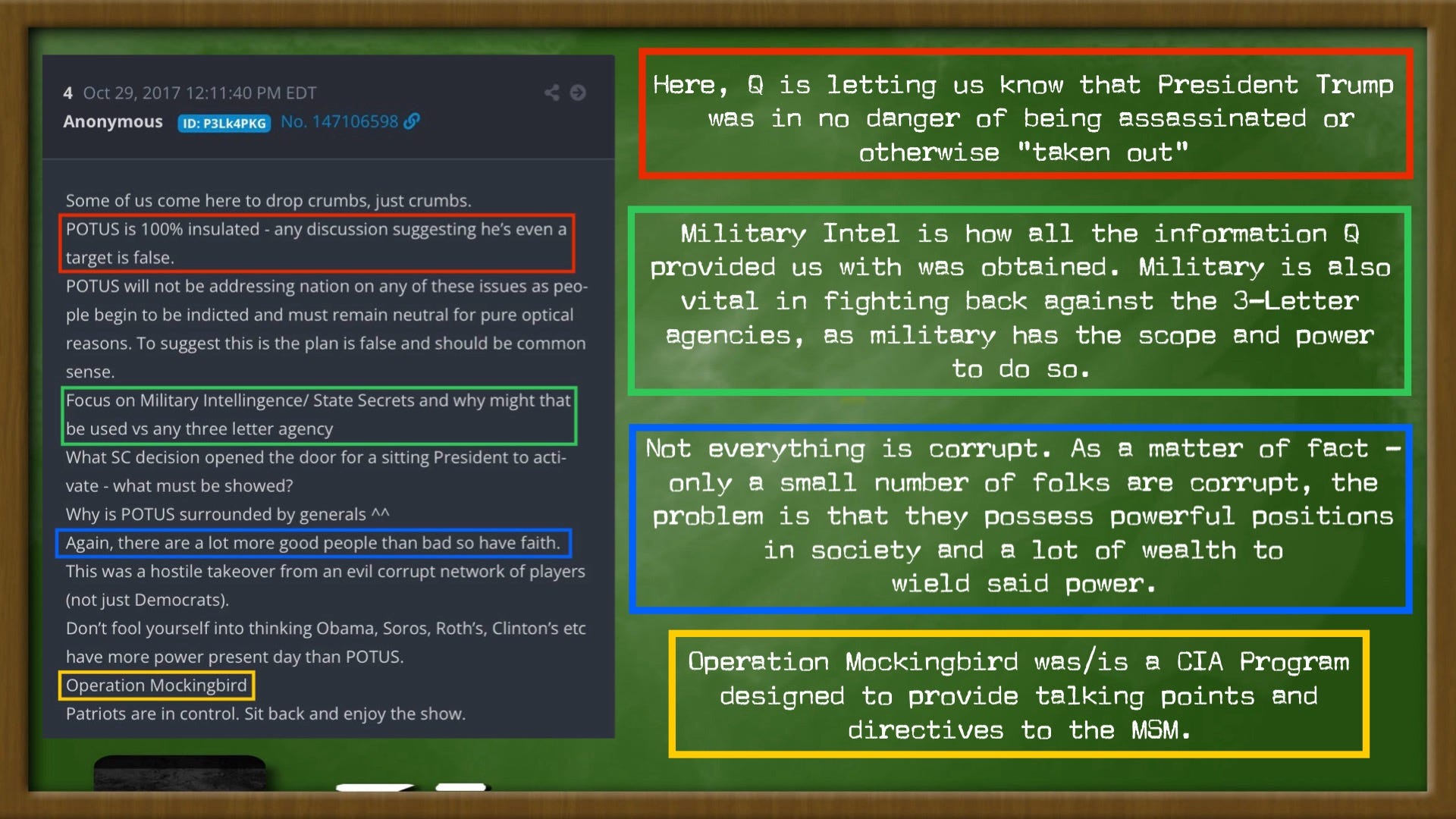 I will be very blunt about this: Those espousing those sort of opinions—that Q said the military would save us, or that Q told people to stay home A) have never read the drops, B) don’t understand the drops, or C) are purposely misrepresenting them with nefarious intentions.