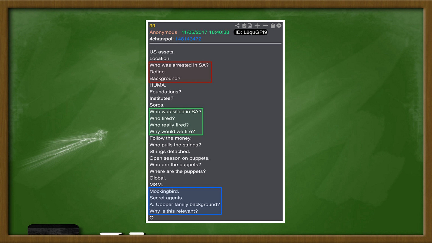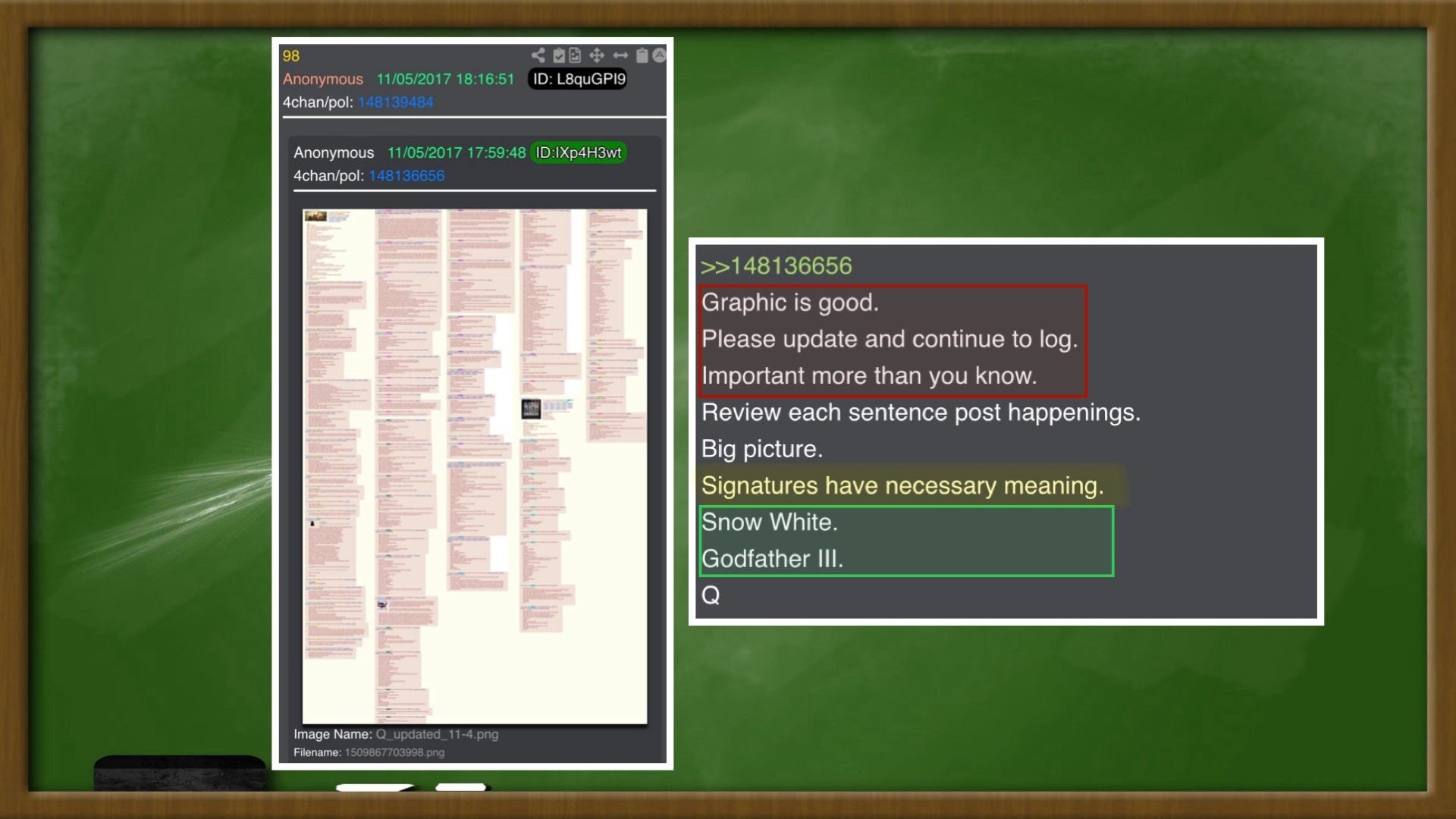 Q, of course - is referencing the graphic he has requested multiple times—a graphic containing the drops in order. Q goes on to reiterate how important this is. This is neither the first, nor the last time this graphic will be brought up.