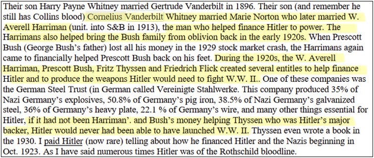 Annnnnd there it is. Cornelius Vanderbilt helped to fund Hitler and the Nazi effort in WWII. If you’ve watched JFK to 9/11: Everything Is A Rich Man’s Trick, then you know that Avril Harriman and Cornelius Vanderbilt were also very much involved in the assassination of JFK.