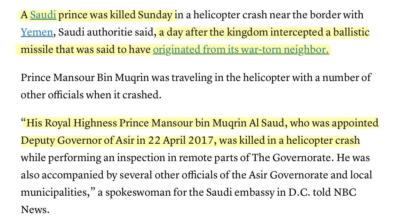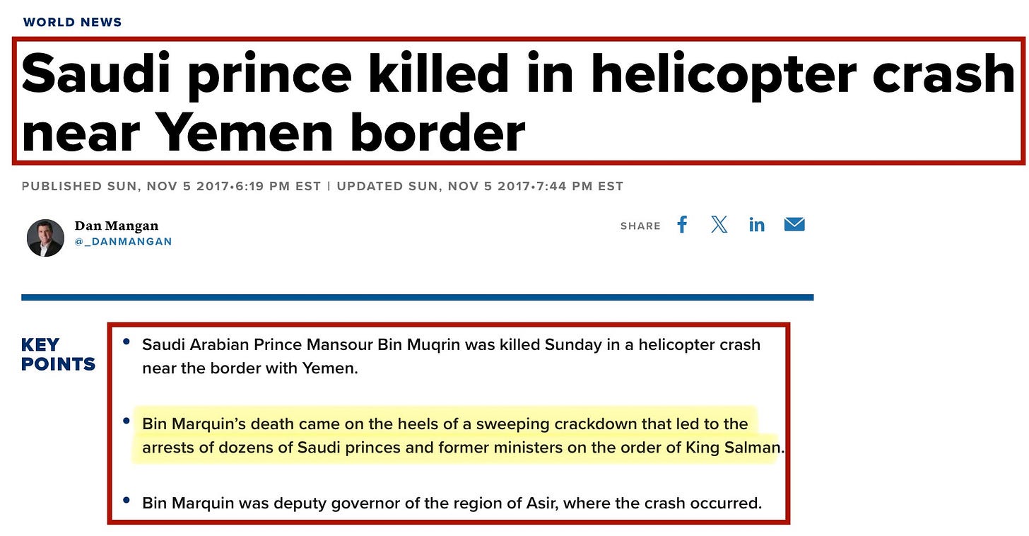 So, we have Las Vegas, a missile being launched at Riyadh, and then we have a Saudi crackdown in which this Prince dies in a “crash”.