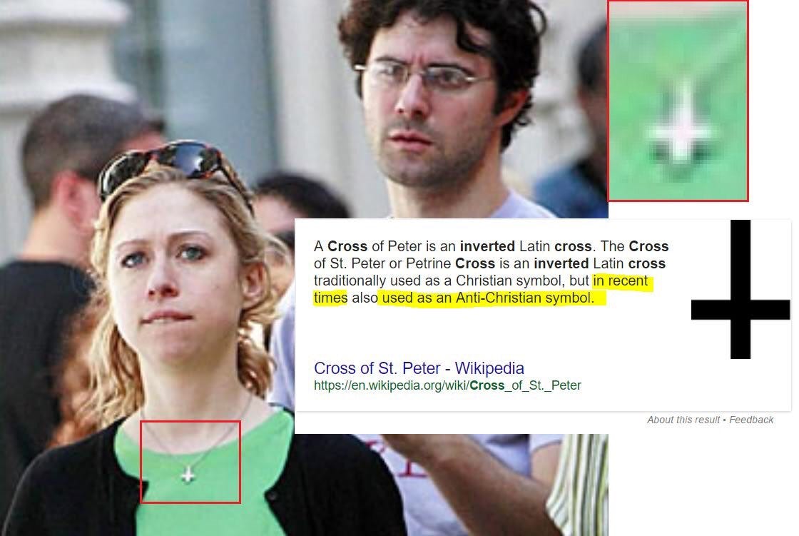 But, in short: Damn near all of these vultures in government worship Satan. As with most symbolism, these evil people have inverted the upside down cross as well, as originally it represented the crucifixion of St. Peter. However, it is also used to represent Satanism. In my opinion, Q is referring to Chelsea Clinton here, who openly wears an upside down cross: