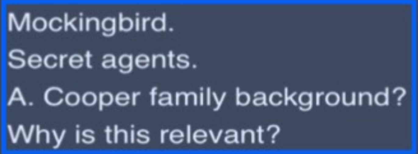 The last section of this drop I will highlight mentions “Mockingbird,” which we know to be referencing “Operation Mockingbird”, a CIA-run program that essentially controls the Mainstream Media.