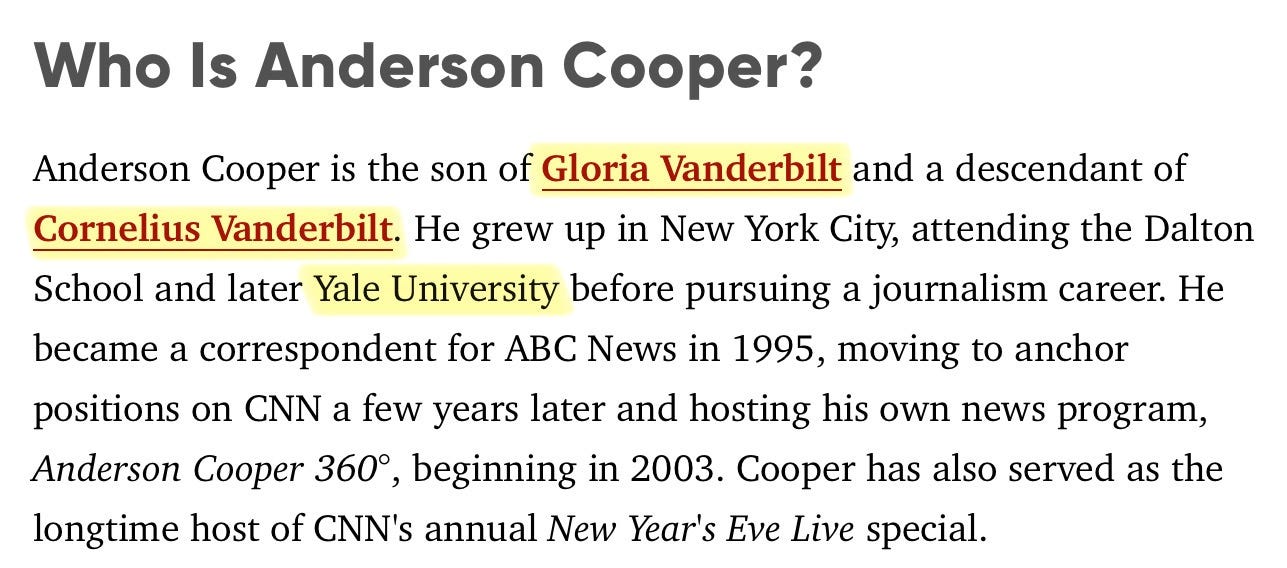 Anderson Cooper is just such a clown, as he actually never attended school for journalism and is a member of the Vanderbilt family.