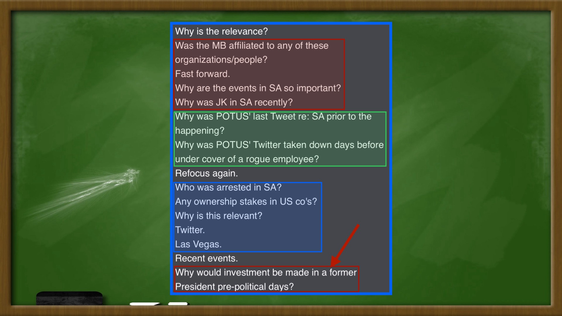 We are then asked “what just happened in SA,” and, as you will recall, a major crackdown and purge of corruption in the Saudi Royal Family and government had just taken place. Al Waleed bin Talal was among those arrested, and his funds were seized, meaning the endless pipeline of corrupt money flowing from Saudi Arabia and into our government had been cut off at this point.