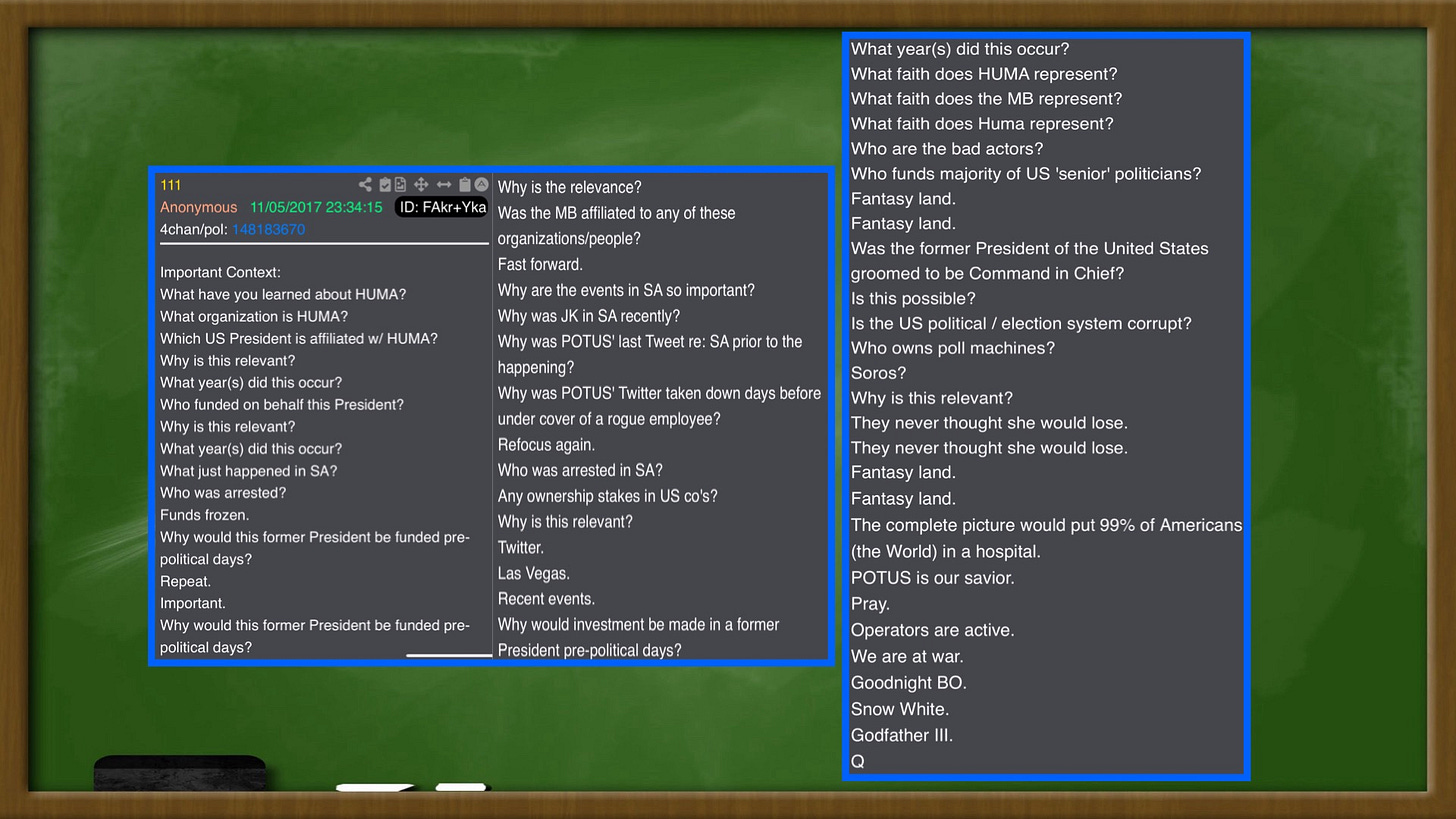 Moving on, Q mentions “Fantasy Land”. This is a reference to Saudi Arabia, and the corruption within—not only that, but how their corruption had become our corruption.