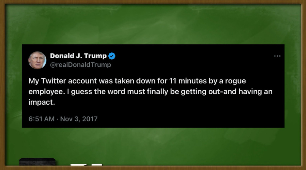 Next, we are asked what was POTUS’s last tweet before the Saudi happenings, and then we are asked why his account was taken down.