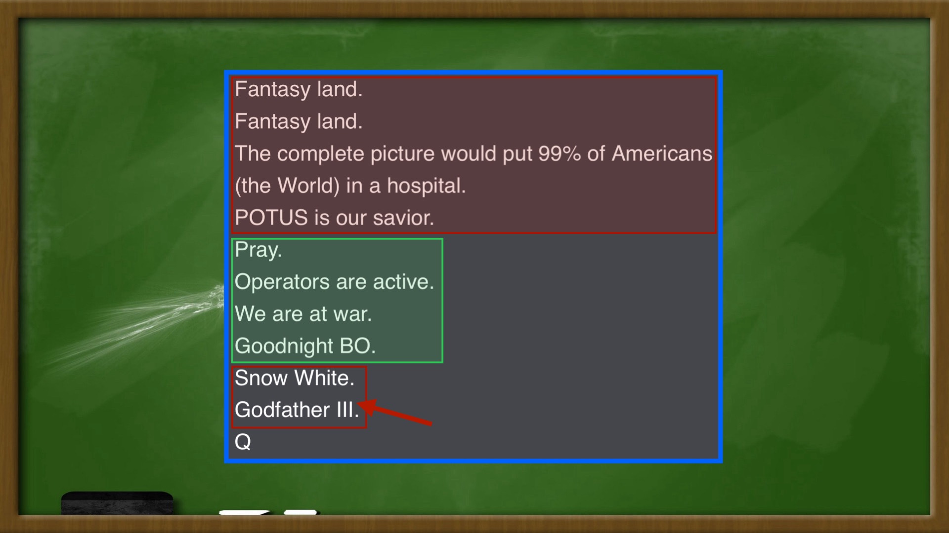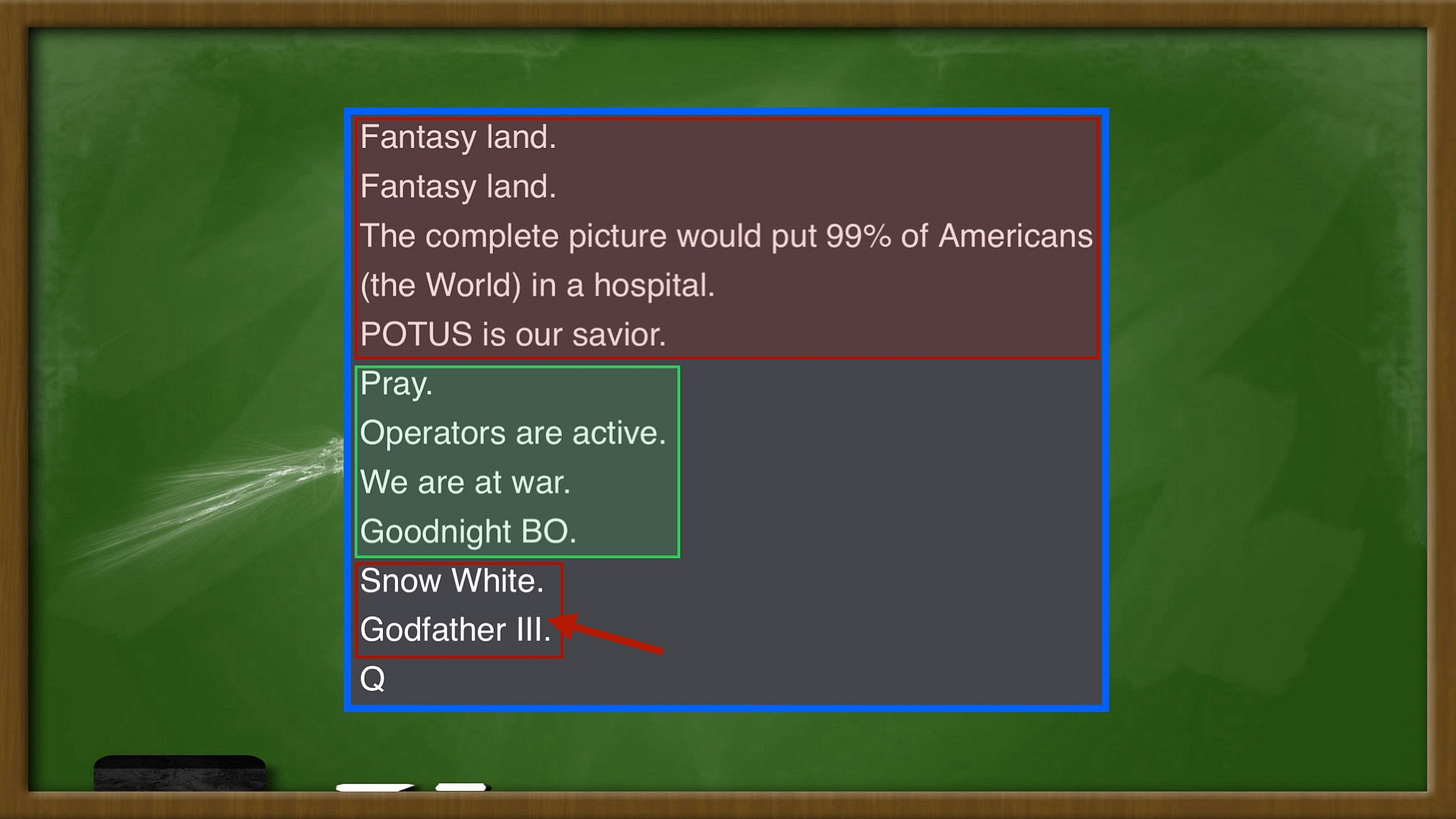 Again, we see “fantasy land” mentioned, followed by Q telling us that the complete picture would place 99% of the population in a hospital. While that is vague, I believe it is making reference to the fact that the evil we face is so dark and depraved that having all the truth of it out there at once would break the psyche of many, many people. This is why all of this truth had to be slow walked out to the public.